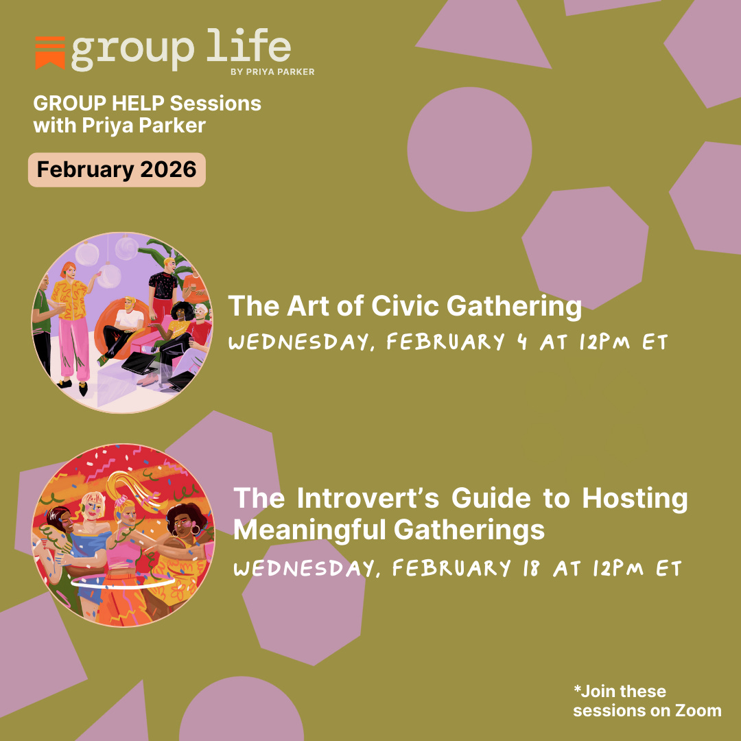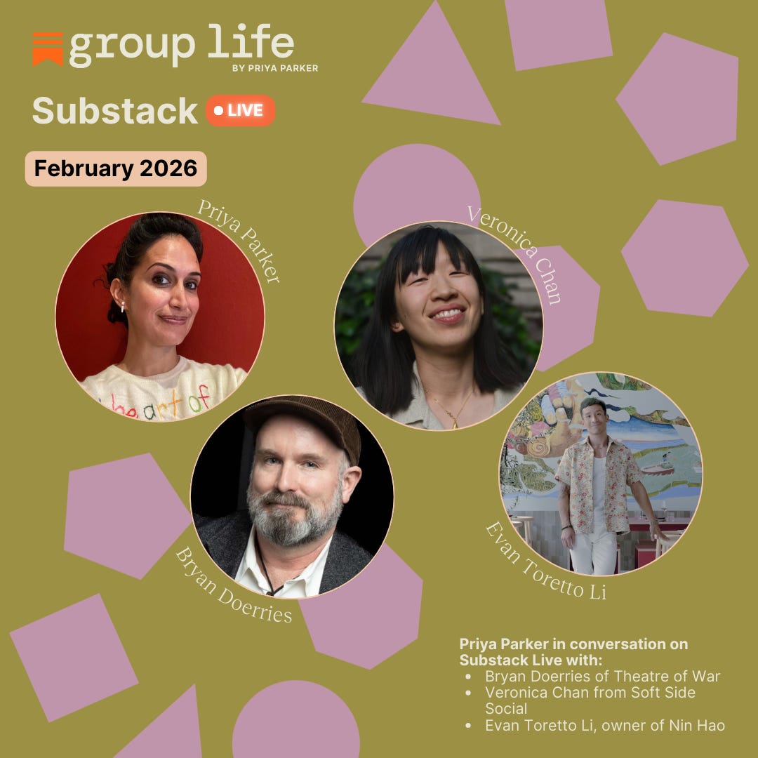 *To join any of these Substack Lives, add them to your calendar using the links above. Make sure you’re subscribed to GROUP LIFE so Substack can email you the link when we go live on the day of. If the email doesn’t show up, just head to priyaparker.substack.com and the video will be playing on Group Life. Click on the video to join us.