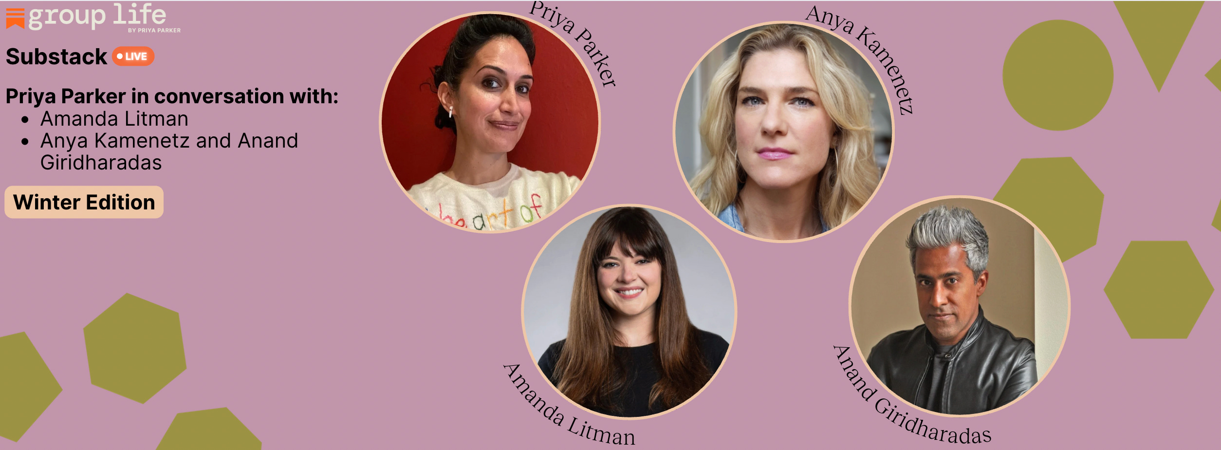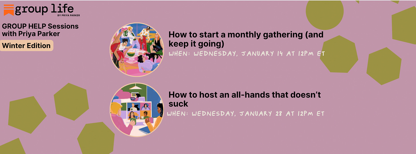 *To join any of these Substack Lives, add them to your calendar using the links above. Make sure you’re subscribed to GROUP LIFE so Substack can email you the link when we go live on the day of. If the email doesn’t show up, just head to priyaparker.substack.com and the video will be playing on Group Life. Click on the video to join us.
